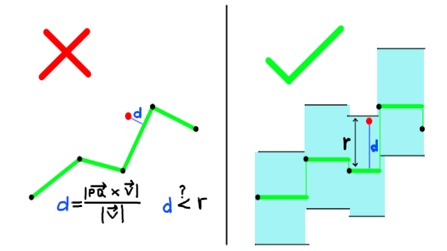 Now, finding whether an arbitrary line segment bisects a circle is unnecessarily complicated for this problem, so instead, we can consider the slice line as a bunch of straight horizontal or vertical lines (like a Riemann sum) and “quadrangulate” a polygon extending r units up and down from each segment (like triangulation, but with rectangles). If the enemy’s 2D position is within this polygon, it’s a kill!