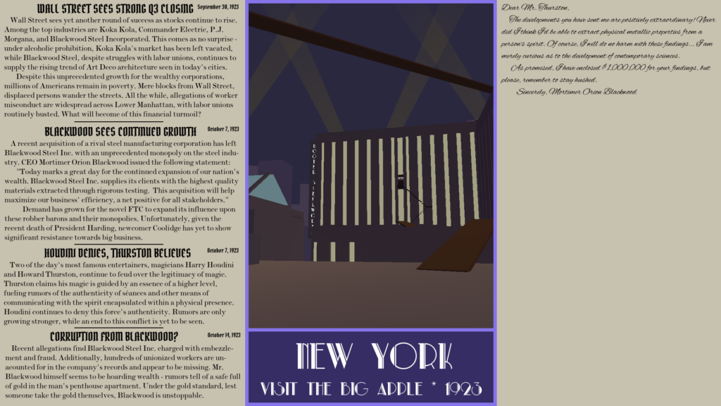 Blackwood was made for the 2023 Scream game jam. It’s a 1920s-style Art Deco horror game framed within a vintage poster. As you ascend up the skyscrapers of Lower Manhattan, you’ll uncover newspaper clippings revealing the story of Mortimer Orion Blackwood, steel executive and robber baron, but be careful – it appears there’s more to this man’s story than meets the eye!